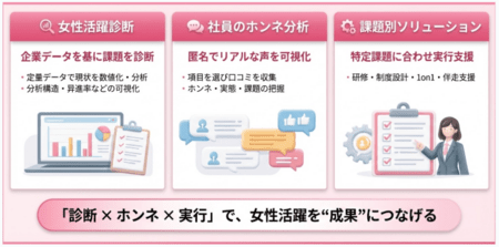 本サービスは、女性活躍を“感覚”や“姿勢”ではなく、データに基づいて判断・改善できる状態をつくることを目的としています。
