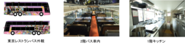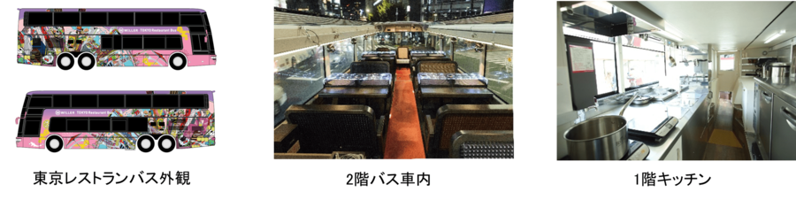 移動と食の融合により新たな感動体験を提供する「レストランバス」は、1階にキッチン、2階には対面式の座席とテーブルを備え、透明で開閉可能なオープンルーフは開放感があり、いつもと違う目線から眺める景色と、本格的な料理をお楽しみいただけます。東京レストランバスの外装は、東京らしさをイメージし、多数のビル群や観光名所を“食”と掛け合わせてポップなカラーリングでデザインしています。内装は、シックな色合いでまとめ、夜は調光可能なLEDと間接照明により、高級感あふれる落ち着いた空間になっています。