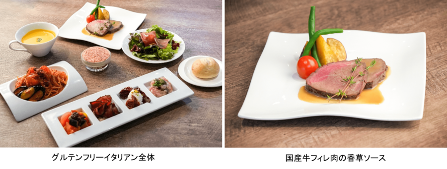 ②料理は、多様なライフスタイルや健康志向のお客様にも心から食事を楽しんでいただけるよう、国産牛フィレ肉の香草ソースや米粉パン、グルテンフリーパスタ、キャラメルティラミスなど、満足感の高いフルコース「グルテンフリーイタリアン」を提供します。
