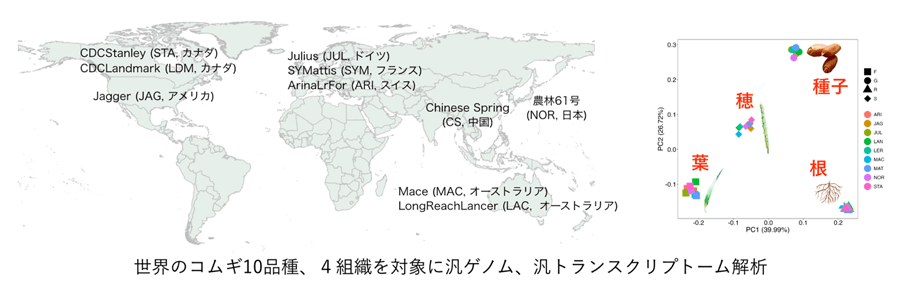 図1 解析に用いた世界のコムギ10品種。国際10+コムギゲノムプロジェクトなどにより高精度のゲノムDNA配列情報と遺伝子発現情報が得られた。