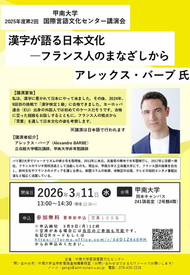 甲南大学(神戸市東灘区)国際言語文化センター(所長:高龍秀)は3月11日(水)、アレックス・バーブ氏による講演会「漢字が語る日本文化 ― フランス人のまなざしから」を開催します。バーブ氏は立命館大学嘱託講師、甲南大学非常勤講師としてフランス語の授業を担当するほか、新聞コラムの執筆、体験記の出版、テレビの知的エンタメ番組出演など幅広く活動しています。講演会では、漢字検定1級の受検からEU出身者で初となる合格に至った経緯を語るとともに、フランス人の視点から「言葉」を通して日本文化の姿を考察します。参加無料、要事前申込(定員100名)。