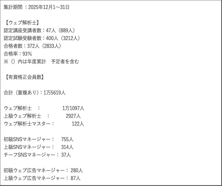 2025年12月末現在のウェブ解析士、SNSマネージャー、ウェブ広告マネージャーの資格保有者数は合計1万5619人でした(重複者あり)。