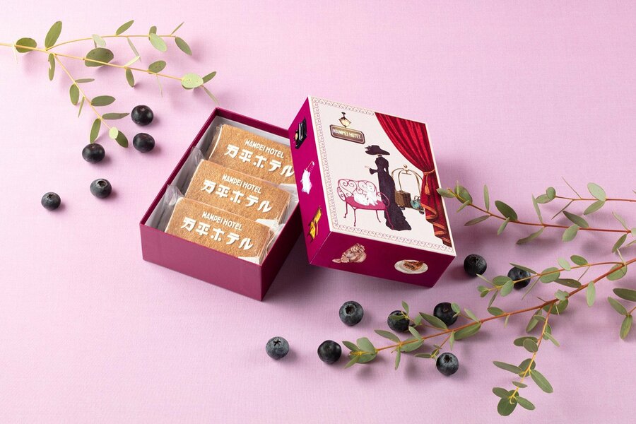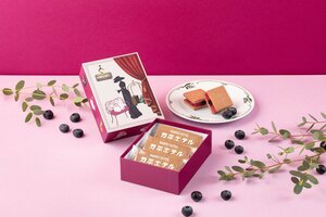 2025年8月の発売以降、ご好評をいただいている「くるみのビターキャラメルサンド」に続き、ホテルの魅力を詰め込んだ「物語を味わうクッキーサンドシリーズ」がスタート。第1弾として登場するのは、甘さ控えめのクッキーで、カフェテラスの人気メニューである「ブルーベリータルト」に着想を得たクリームをたっぷりとサンドした「カシス&ブルーベリーサンド」です。フレッシュなブルーベリーをふんだんに使用したジャムとカシスを合わせた、華やかな味わいをお楽しみください。また、パッケージにはテレビCMでおなじみの万平ホテルで、貴婦人の優雅な滞在を表現。創業時から掲げられている看板や、猫足のバスタブ、さらにはアップルパイやロイヤルミルクティーなど、万平ホテルを象徴するモチーフがちりばめられています。