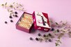 「物語を味わうクッキーサンドシリーズ」の第1弾として登場する「カシス&ブルーベリーサンド」。カシスとブルーベリーを合わせたクリームは、濃厚ながら軽やかな口当たりに仕上げました。パッケージには、貴婦人の優雅な滞在をイメージさせるデザインや、万平ホテルを象徴するモチーフを描きました。