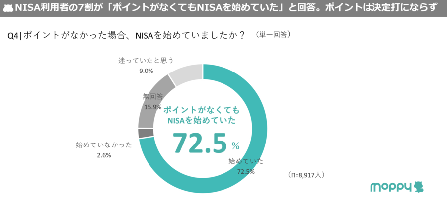 ・NISA利用者の7割が「ポイントがなくてもNISAを始めていた」と回答。ポイントは動機にはならず