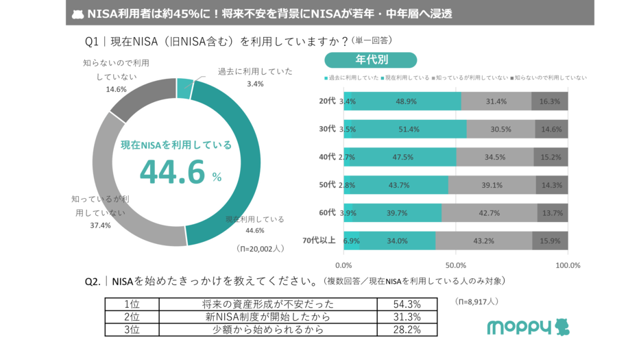 ・NISA利用者は約45%に!将来不安を背景にNISAが若年・中年層へ浸透