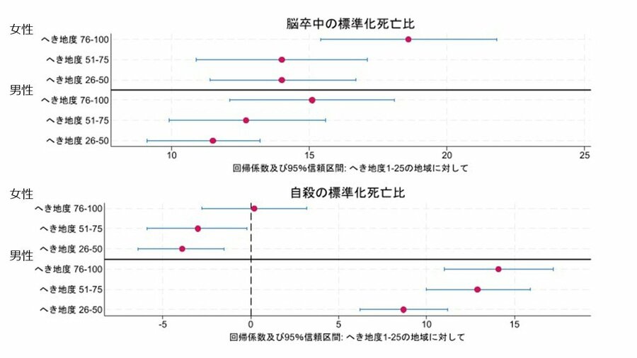 脳卒中および男性の自殺で、「へき地度」と標準化死亡比に明確な用量反応関係があった