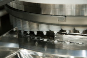 打錠工程で錠剤が臼から排出される瞬間