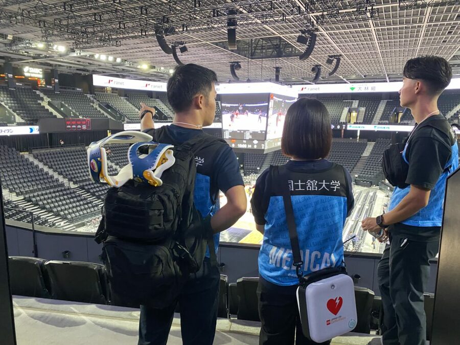 国士舘大学では、医師・救急救命士・アスレティックトレーナーの資格を有する教員および救急救命士を目指す学生、本学独自資格であるスポーツファーストレスポンダー(SFR)の資格を有する学生から構成されるメディカルサポートチームを組織しています。本サポートチームは、観客の方々が安心してチームを応援できるような救護体制を構築しており、サッカーやバスケットボール、ラグビーなどさまざまなスポーツ大会で実績があります。会場では、チームの方々と連携し、体調不良者の早期発見・適切な応急手当を行うとともに、救急処置に関する啓発活動を行うなど「安心・安全」なスポーツ現場構築へ総合的に貢献しています。