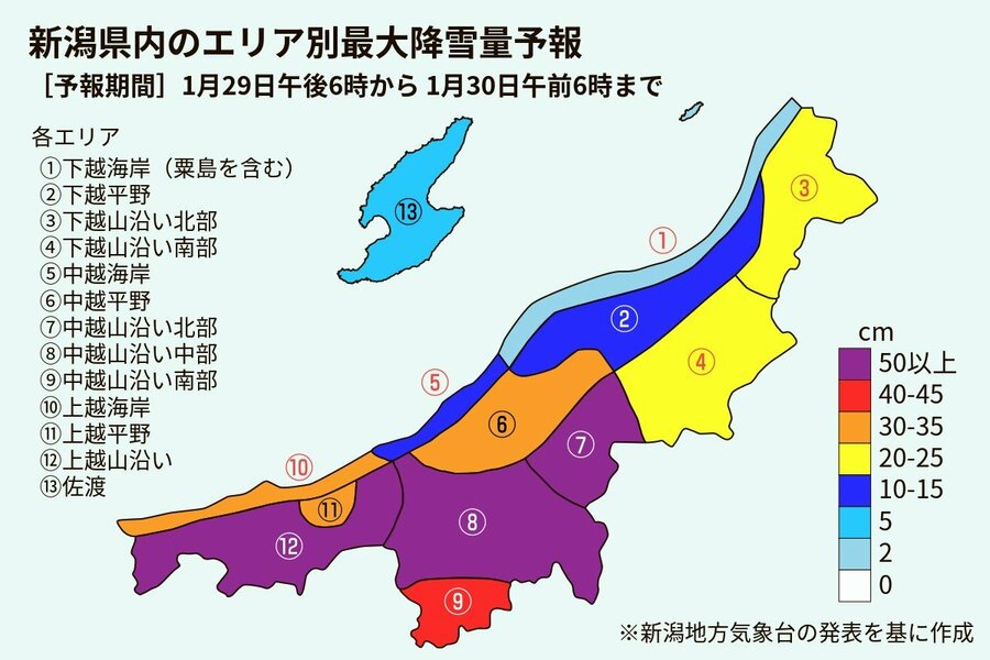 30日午後6時までに予想される24時間降雪量は、多い所で上中越の山沿いで70センチ、上中越の平地と下越の山沿いで40センチ、下越の平地と佐渡で15センチ。