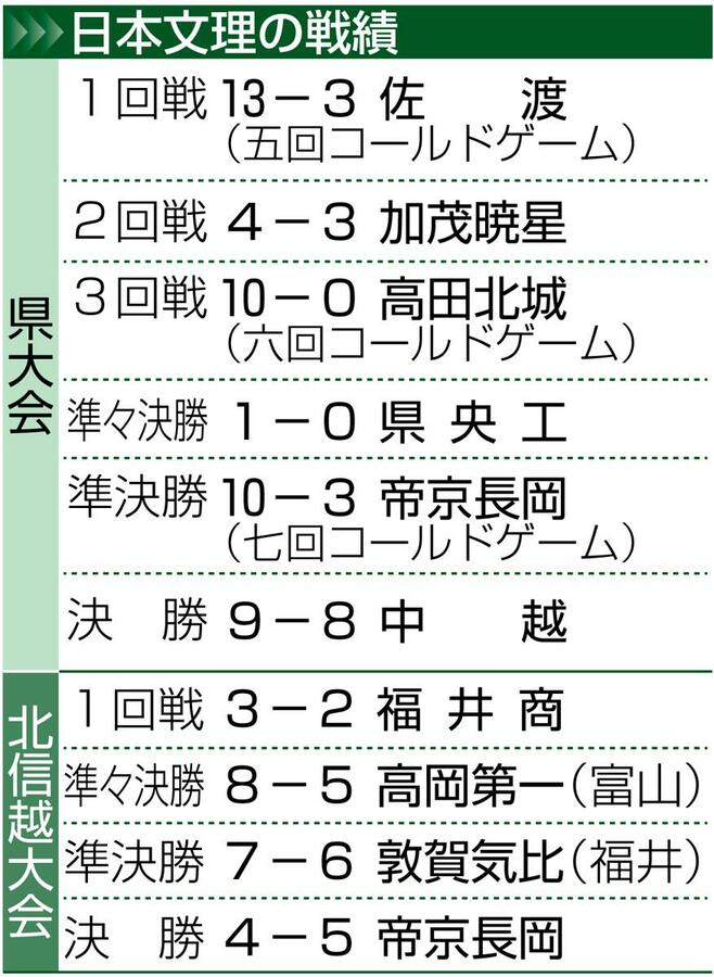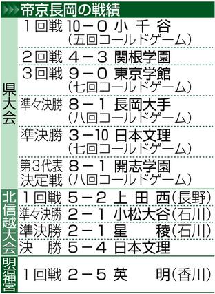 帝京長岡は1年生エースの工藤壱朗(いちろう)投手を中心に、機動力も絡めて北信越大会を勝ち上がり、決勝で日本文理との県勢対決を制した。日本文理は秦碧羽(はたあおば)選手を軸とする強力打線が光った。