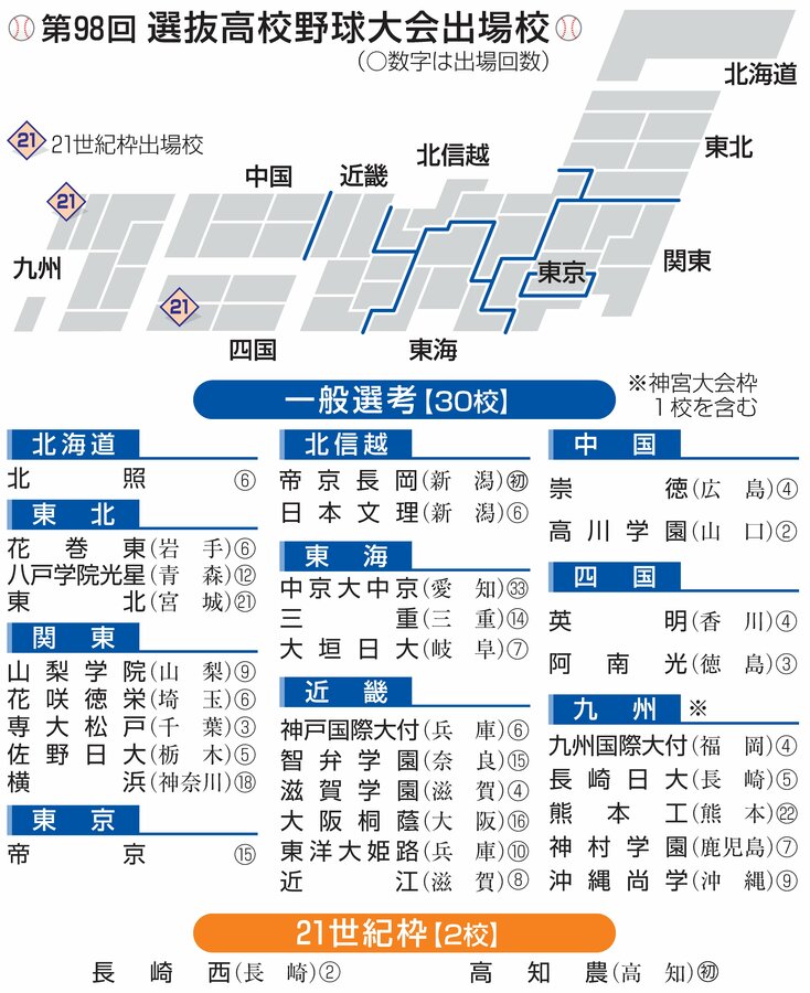 第98回選抜高校野球大会(3月19日開幕・甲子園)の出場校32校を決める選考委員会が30日、大阪市内で開かれ、昨秋の北信越大会で優勝した帝京長岡(長岡市)の初出場と、準優勝した日本文理(新潟市西区)の12年ぶり6回目の出場が決まった。県勢が一般選考枠で2校同時に出場するのは初めて。