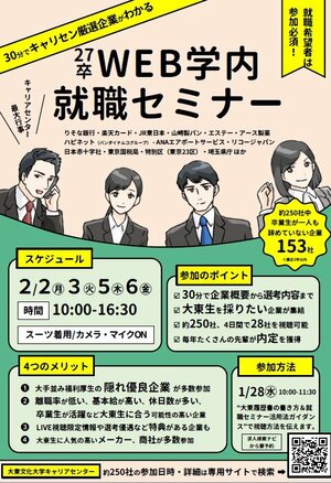 大東文化大学(東京都板橋区)は2月2日(月)、3日(火)、5日(木)、6日(金)の4日間、2027年3月卒業予定の同大の学生を対象とした「WEB学内就職セミナー」を開催する。採用選考の早期化が進む中、同大では卒業後の最初の就職先である「ファーストキャリア」を大切にした支援を展開。今回のセミナーでは、キャリアセンターが「大東生に合う」と自信を持って厳選した237の企業・団体が集結する。特筆すべきは、参加企業・団体の6割を超える153社が「直近3年以内の大東文化大学卒業生の離職者ゼロ」という高い定着率を誇る点。現代の学生が求める「タイパ就活」の利便性を確保しながらも、「企業との接点」を重視し、学生が納得感を持って社会へ踏み出せるようバックアップする。