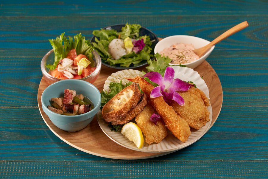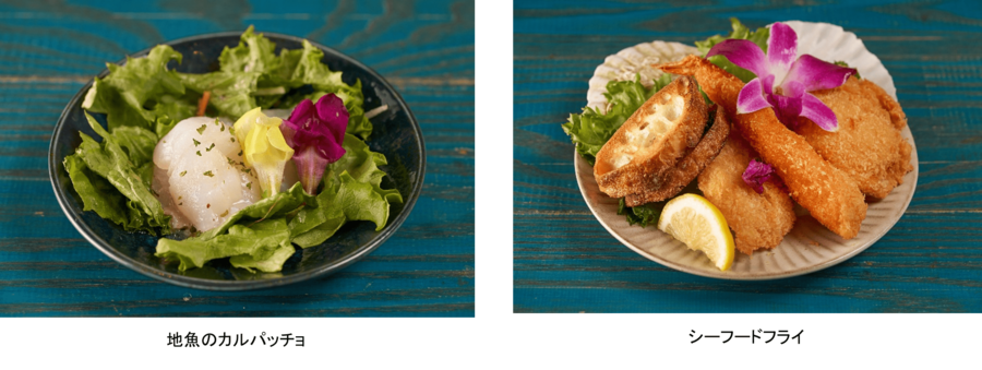列車がそのままバルとなり、夕方から夜にかけて運行するトレインバルコース。本コースは、舞鶴の漁港で水揚げされた地魚を中心に、カルパッチョやアヒージョ、フライなど、お酒とともに気軽に楽しめる海鮮料理を提供します。