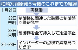 東京電力柏崎刈羽原発の稲垣武之所長は29日、再稼働直後のトラブルで停止した6号機について、営業運転開始までの従来の工程を見直す考えを示した。原子力規制委員会へ提出した計画で2月26日としていた営業運転開始は遅れる見通し。原子炉を再び起動する時期については「そう遠くない」としたが、具体的な日程は示さなかった。
