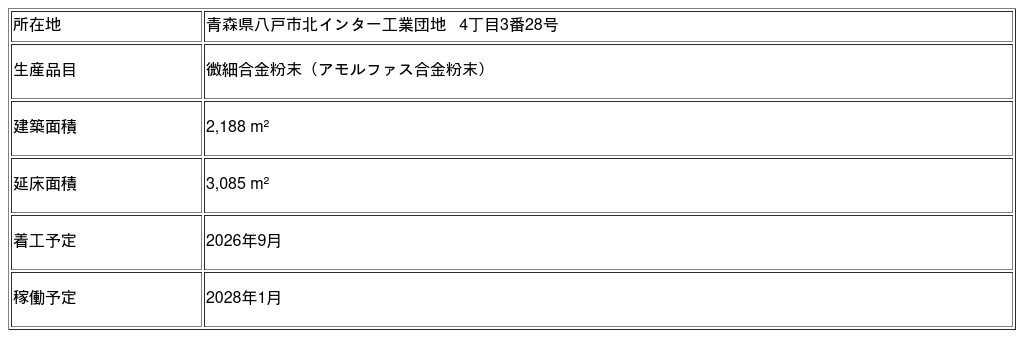 新工場は2026年9月に着工し、2028年1月の稼働を予定しています。新工場の稼働により、アモルファス合金粉末の生産能力を現在の年間約6,000tから、2028年度までに年間約8,000tに増強させることを目指します。また、新工場の増設によって、アモルファス合金粉末の生産ラインは現行の本社工場と北インター事業所を含めた3拠点体制となり、新工場は製品の安定供給とともに事業継続計画(BCP)の点でも大きな役割を担います。