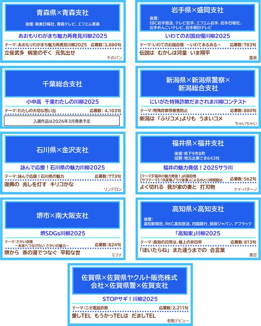 2025年は、全国の自治体や警察など9団体に参加いただき、14,829句の作品が集まりました。地元の魅力で詠む「お国自慢」をはじめ、詐欺撲滅をテーマにした作品など、全国各地からユーモアあふれる川柳が多数寄せられました。