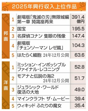 日本映画製作者連盟(映連)は28日、2025年の映画概況を発表した。邦画と洋画を合わせた国内興行収入(興収)は前年比32・6%増の2744億円で過去最高となった。「劇場版『鬼滅の刃(やいば)』無限城編 第一章 猗窩座(あかざ)再来」「国宝」などが大ヒットした邦画の興収は同33・2%増で2075億円に達した。