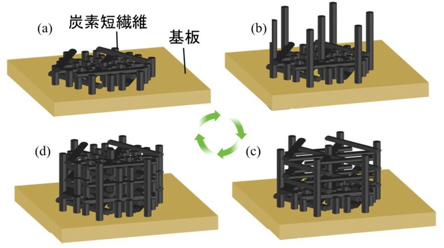 炭素繊維強化プラスチック(CFRP)のリサイクル過程で発生する「短炭素繊維(SCF)」は、短い繊維長を持ち、機械的特性に優れるだけでなく、導電性や化学的安定性にも高い性能を有しています。そのため、バルク形状の構造体へ成形できれば、各種電極材料や水質浄化材料などへの応用が強く望まれていました。しかし従来のSCF成形技術(不織布製造法、静電植毛法、加圧成形法など)では、短繊維の成形が困難である、高さ方向への積層ができない、接着剤が必要であり導電性を損なう可能性があるといった課題がありました。