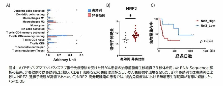 図4: A)アテゾリズマブ/ベバシズマブ複合免疫療法を受けた肝がん患者の治療前腫瘍生検組織33検体を用いたRNA-Sequence解析の結果、非奏効例では奏効例と比較し、CD8T細胞などの免疫湿潤が乏しいがん免疫微小環境を呈した。B)非奏効例では奏効例と比較し、NRF2遺伝子発現が高値であった。C)NRF2高発現腫瘍の患者では、複合免疫療法における無増悪生存期間が有意に短縮した。 *p<0.05