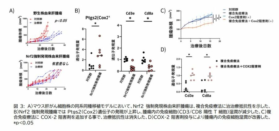 図3: A)マウス肝がん細胞株の同系同種移植モデルにおいて、Nrf2 強制発現株由来肝腫瘍は、複合免疫療法に治治療抵抗性を示した。B)Nrf2 強制発現腫瘍では Ptgs2(Cox2)遺伝子の発現が上昇し、腫瘍内の免疫細胞(CD3/CD8 陽性 T 細胞)湿潤が減少した。C)複合免疫療法に COX-2 阻害剤を追加することで、治療抵抗性は消失した、D)COX-2 阻害剤投与により腫瘍内の免疫細胞湿潤が改善した。 *p<0.05