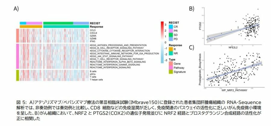 図5: A)アテゾリズマブ/ベバシズマブ療法の第Ⅲ相臨床試験(IMbrave150)に登録された患者集団肝腫瘍組織のRNA-Sequence解析では、非奏効例では奏効例と比較し、CD8細胞などの免疫湿潤が乏しく、免疫関連のパスウェイの活性化に乏しいがん免疫微小環境を呈した。B)がん組織において、NRF2とPTGS2(COX2)の遺伝子発現ならびにNRF2経路とプロスタグランジン合成経路の活性化が正に相関した。