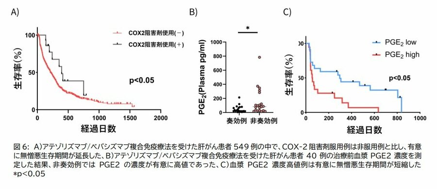 図6: A)アテゾリズマブ/ベバシズマブ複合免疫療法を受けた肝がん患者549例の中で、COX-2阻害剤服用例は非服用例と比し、有意に無憎悪生存期間が延長した。B)アテゾリズマブ/ベバシズマブ複合免疫療法を受けた肝がん患者40例の治療前血漿PGE₂濃度を測定した結果、非奏効例ではPGE₂の濃度が有意に高値であった、C)血漿 PGE₂濃度高値例は有意に無憎悪生存期間が短縮した。 *p<0.05