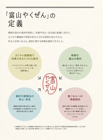 「新鮮な富山の食材を使用し、栄養面や安心・安全面に配慮しながら、古くから健康面で効果があるとされる食材を加え、食べる人に料理や食材の情報を提供できるもの」を、料理店等に公募し、専門知識を有する認定委員による試食審査を経て、「富山やくぜん」として認定しています。