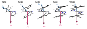 図3.理論計算により得られた分子長に伴う遷移双極子モーメントの配向変化