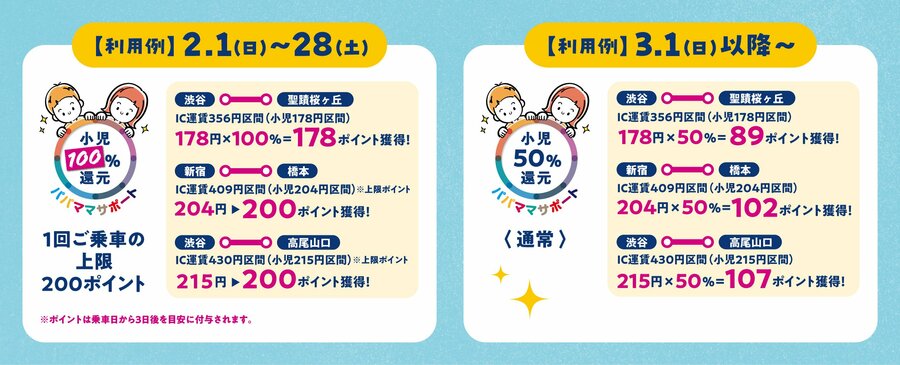②鉄道乗車ポイントサービス「京王トレインポイント」に登録している小児会員を対象とし、通常小児運賃で乗車する場合、1回の乗車ごとに当社線の乗車運賃の50%分の「京王トレインポイント」を付与するところ、対象期間中は100%分還元。京王線・井の頭線の小児運賃を実質無料とする。
