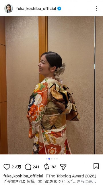投稿では、受賞店への祝福の言葉とともに「私は食べることが大好きで、美味しいご飯にいつも元気をもらっておりますので、参加させて頂けてとても嬉しかったです」「そして数年ぶりに振袖を着せて頂きましたっ!食べログカラーで、とても華やかでした そしてこの髪飾り!なんと刺繍で出来ているんです すごく繊細で、光にあたると上品に煌めいて、、トキメキでした」と衣裳を紹介し、華やかな着物姿でさまざまな表情を見せるショットを複数枚アップした。