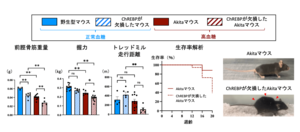 インスリン不足によって生じるダイアベティスのモデルマウスにおいて、ChREBPを欠損させると、血糖値が同程度であっても、著しい筋萎縮、筋力低下、さらには寿命の短縮が認められました。