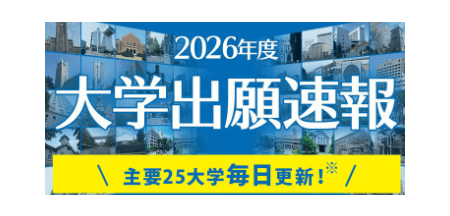 各大学の志願者数や出願倍率など、出願状況をチェックできる、東進の「大学出願速報2026サイト」も便利です( https://www.toshin.com/examinee/ )。主要25大学については、毎日更新しています。
