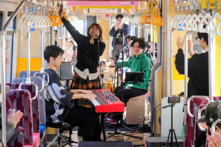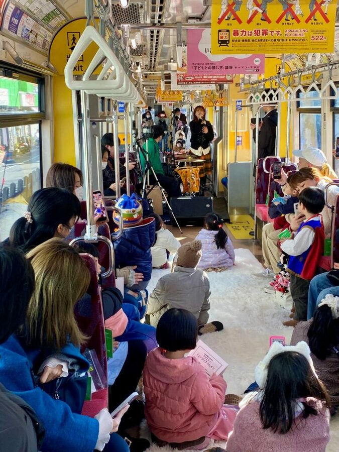 舞台となった東急世田谷線は、三軒茶屋―下高井戸間を繋ぐ全長約5kmの路線で、2025年5月に開通100周年を迎えたことを記念して様々なイベントが展開されている。今回のイベントもその一つであり、路面電車が同区間を往復する約40分間で行われた。プロジェクトリーダーの山本さんはドラムの演奏家として活動しており、当日はボーカリストの緒方利菜さんとピアニストの榎本響さんを迎えて、電車内でバンド演奏を披露。「いつか王子様が」「虹の彼方に」など、子どもたちもよく知るポピュラーな曲の演奏と歌声を届け、地域の人々を楽しませた。