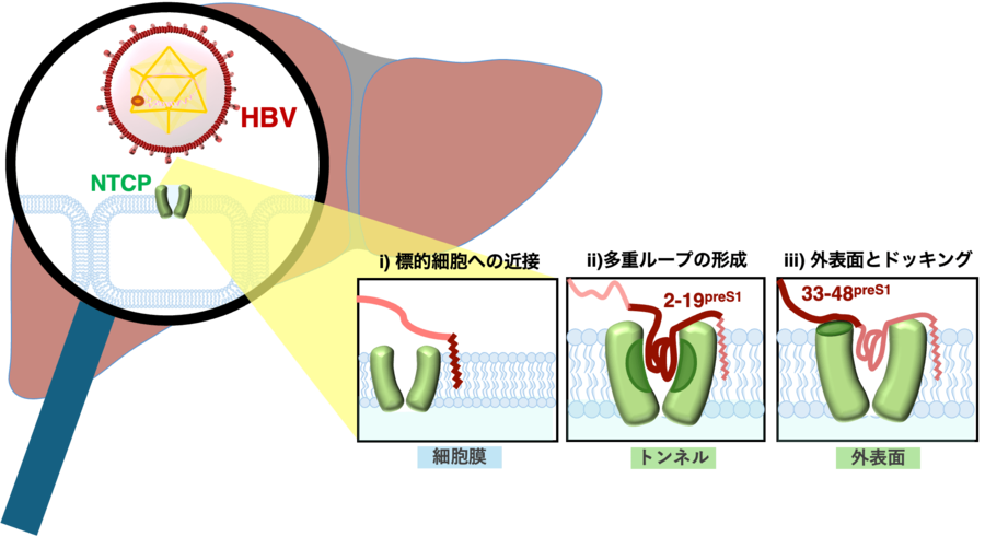 これは、B型肝炎ウイルスが標的肝細胞のみを効率よく認識・感染するメカニズムを明らかにしたものであり、HBV感染を阻害する治療薬のデザイン・開発につながると期待されます。