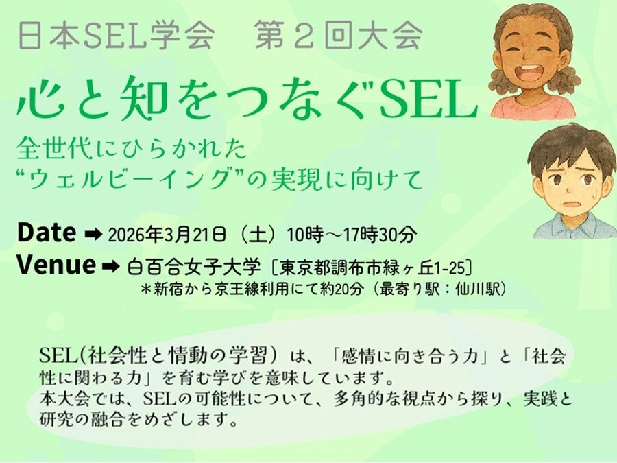 SEL(社会性と情動の学習)は、「感情に向き合う力」と「社会性に関わる力」を育む学びを意味しています。 本大会では、SELの可能性について、多角的な視点から探り、実践と研究の融合をめざします。