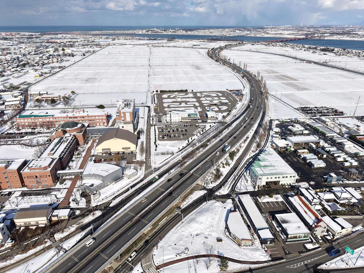 新潟市と新発田市をつなぐ大動脈「新新バイパス」(延長17・2キロ)。1989年に全線開通し、生活や物流に欠かせないインフラとして、地域の発展を支えてきた。信号がなくスムーズに走行できる立派な道路に、県外ドライバーから「無料の高速道路?」と驚かれることも。車窓の景色は住宅街や工業地帯、田園風景と多彩で、県内第1号という道の駅も人気だ。真冬の新新バイパスを走り、沿線の気になるスポットにふらりと立ち寄った。
