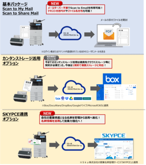 有償オプションの第一弾としては、複合機やスキャナーからお客様が契約しているクラウドストレージへ直接スキャンデータを保存でき、かつPCレスでクラウドストレージ内のデータを印刷できる「カンタンストレージ活用オプション」を提供開始します。これまで提供してきた「RICOH カンタンストレージ活用シリーズ」はクラウドストレージごとに契約が必要でしたが、一つの契約で複数のストレージサービスとの連携が可能になります。また、Sky株式会社の営業名刺管理サービス「SKYPCE」と連携する「SKYPCE連携オプション」もあわせて提供開始します。複合機やスキャナーで名刺を一括スキャンし、SKYPCEに直接登録することができます。SKYPCE に登録された名刺は企業データベースと連携され、顧客情報の共有・活用による営業効率の向上に貢献します。