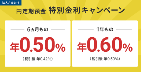 「円定期預金6ヵ月もの」または「円定期預金1年もの」にお預入れいただいた法人のお客さま