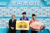全農は、優勝した選手へ副賞として国産黒毛和牛を各ペア10kgと全農直営・みのりみのるブランドの飲食店舗でご使用いただけるお食事券を贈呈しました。両選手は全農の参事 小池克佳からお肉とお食事券の大型パネルを笑顔で受け取りました。