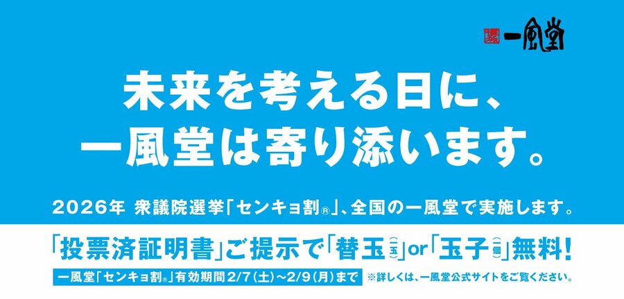 株式会社力の源ホールディングス(本社:福岡市中央区、代表取締役社長:山根 智之)傘下の株式会社力の源カンパニーが運営する博多発祥の世界に展開するラーメン店「一風堂」は、2026年2月8日(日)に投開票される「第51回衆議院議員総選挙」に合わせ、2月7日(土)~2月9日(月)の3日間、国内で営業中の「一風堂」および「一風堂KAY」、フードコート業態店の「IPPUDO RAMEN EXPRESS」「RAMEN EXPRESS 博多一風堂」全店において「センキョ割」を実施いたします。期間中、店舗にてラーメンをご注文のうえ「投票済証明書」をご提示いただいたお客様を対象に、「替玉一玉」もしくは「半熟玉子一個」のいずれかを無料でご提供いたします。当特典は、3日間何度でもご利用いただけます。(1回のご来店につき1品まで)