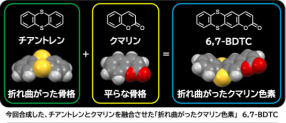 研究グループは、「折れ曲がった」チアントレン骨格を「平面な」クマリン骨格に融合させた新規有機蛍光色素(6,7-BDTC)を設計・合成しました。本分子は、硫黄架橋によってπ共役の拡張を維持しつつ、硫黄原子に由来して折り曲がった分子構造をとる点が特徴です。