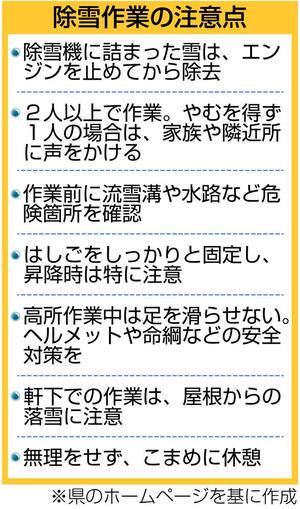 県内は大雪の影響で除雪作業中などの事故が相次ぎ、死傷者が急増している。県によると、今冬の雪に関する人的被害は2日現在で、前年同時期の51人を大きく上回る計144人。このうち死者数は17人に上り、昨冬全体の合計と既に並んだ。除雪中の病気発症や用水路への転落事故なども発生しており、専門家は無理な除雪は避けるなど、注意を呼びかけている。
