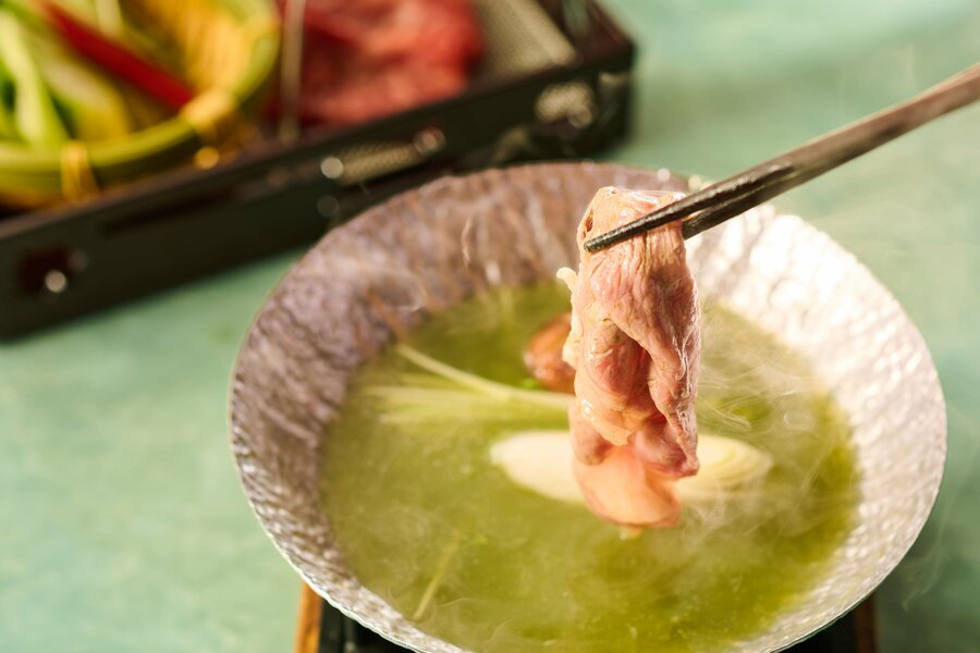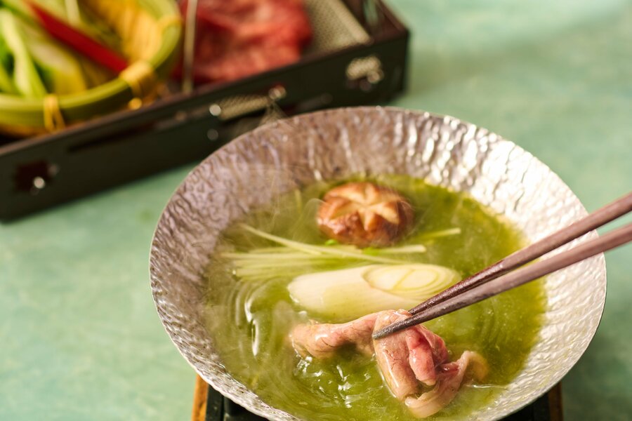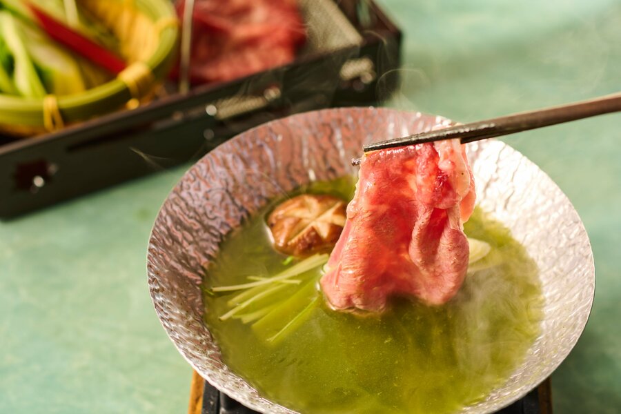 伊東ぐり茶しゃぶしゃぶ、牛肉 長葱 椎茸 スイスチャード アスパラ