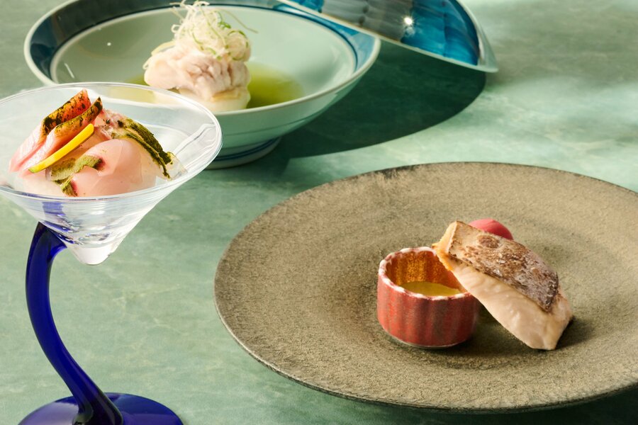 鮎魚女薄葛仕立て、海鮮抹茶餡仕立て