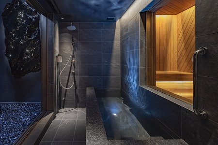 1階フロアをまるごと使用した完全プライベートのサウナ&バスエリア。印象的なアートを配した中庭を中心に、フィンランド式本格サウナとチラー付き水風呂、ヒーリングスペース、4人でも寛ぐことのできる広々とした浴槽をレイアウトし、ご家族、ご友人、カップルでゆったりとお楽しみいただける設計としました。