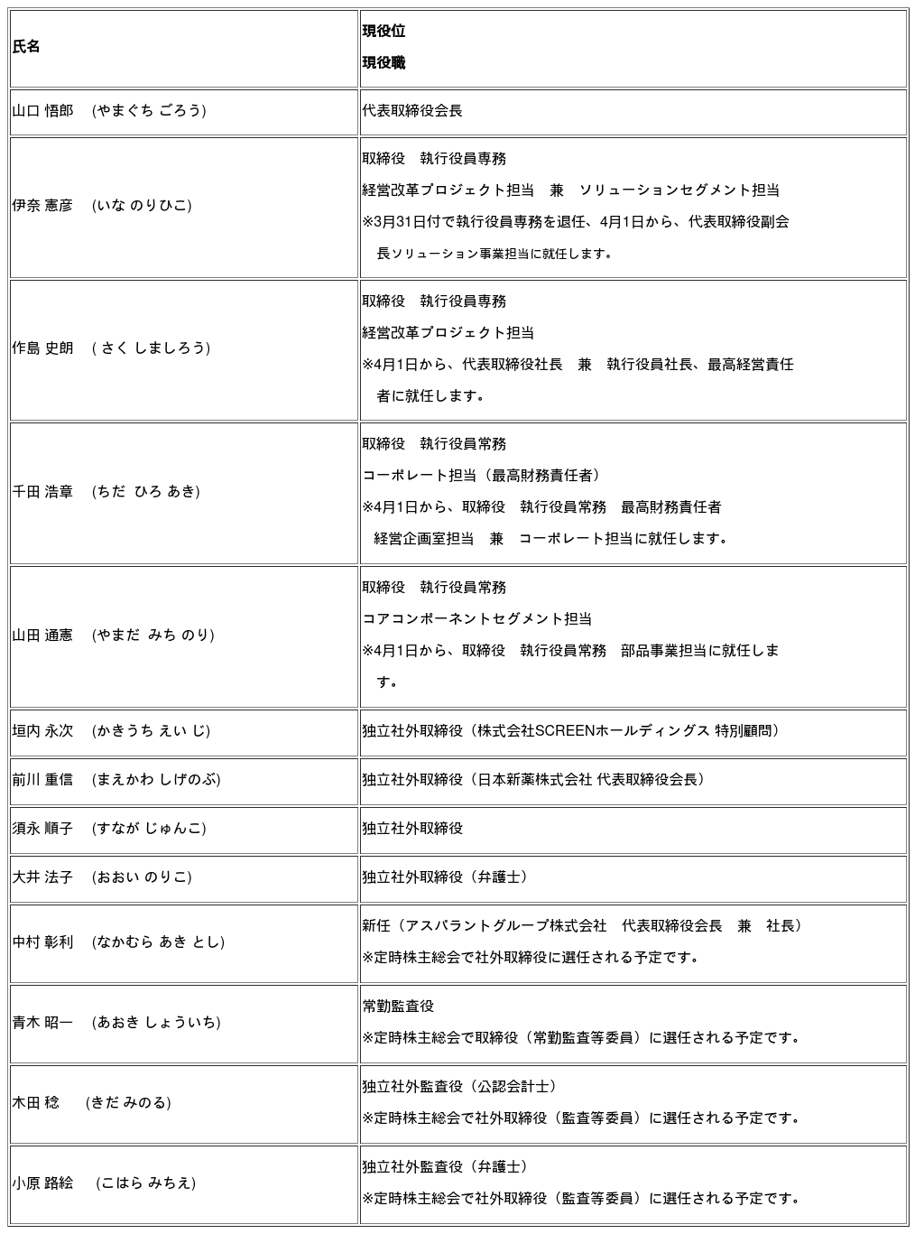 本年6月下旬に開催予定の定時株主総会をもって、以下の2名が取締役を退任する予定です。