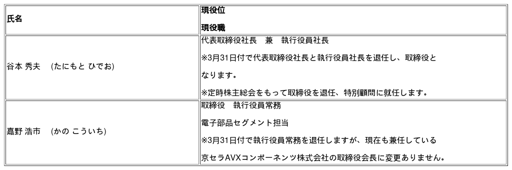 京セラ株式会社(代表取締役社長:谷本 秀夫)は、本年2月2日(月)に開催した取締役会において、下記のとおり役員人事等について決議しましたので、お知らせいたします。