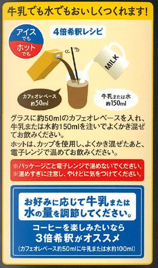 パッケージは黒を基調に、コーヒー専業メーカーが作った王道の味わいを楽しめる大人向けのデザインにリニューアル。側面では味わいの調整ができることをわかりやすく訴求しています。コーヒーとミルクのバランスを楽しみたい方は4倍希釈、よりコーヒー感を味わいたい方は3倍希釈など、自分好みの味わいでお楽しみいただけます。