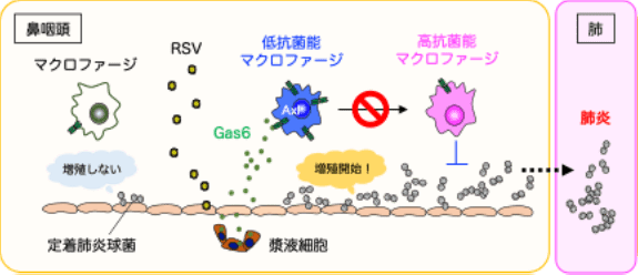 RSウイルス(RSV)に感染すると、鼻の粘膜にある細胞からGas6というタンパク質が産生され、免疫細胞であるマクロファージの受容体Axlを介してその性質を変化させる。この結果、本来細菌を排除する抗菌性のマクロファージ(M1型)の誘導が抑えられる。そのため、普段は症状を起こさず鼻咽頭に定着している肺炎球菌が増殖しやすくなり、肺炎などの感染の重症化につながると考えられる。
